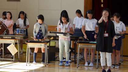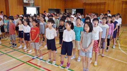 22日(木)朝、体育館で音楽朝会を行いました。今日は「運動会の歌」をみんなで練習しました。伴奏は運動会音楽係の6年生の子どもたちです。毎朝地道に練習を重ねてきました。最初はスクリーンに歌詞を映し出して、みんなで歌いました。