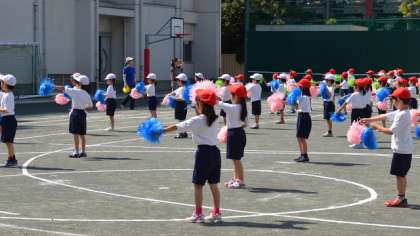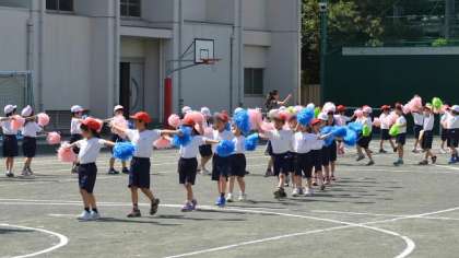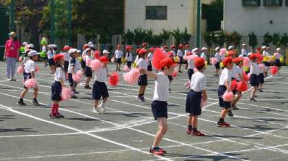 22日1校時、校庭で1年生が運動会の表現種目「あいうえおんがく」の練習をしました。色とりどりのポンポンを両手に持って校庭に集まった1年生の子どもたちは、それだけで満面の笑みです。朝は青空が広がっていて、鮮やかな色合いが映えていました。子どもたちは一生懸命リズムに合わせて踊っていました。