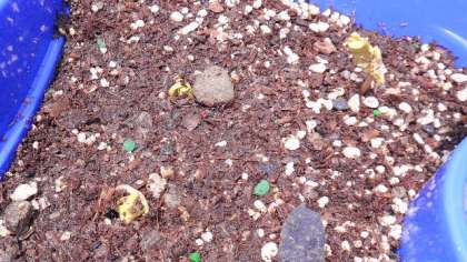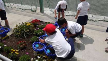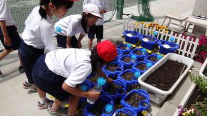 23日中休み、2時間目の運動会練習を終えたばかりの1年生が、校舎前のアサガオの鉢に水やりに来て歓声を上げていました。「わーっ芽が出た}「私のも出ている」・・・後から種まきをしたクラスの子の鉢で、一斉に発芽したのです。よく見ないと見逃してしまいそうな芽です。よく見つけましたね。子どもたち大喜びです。