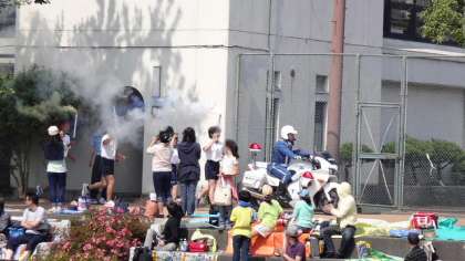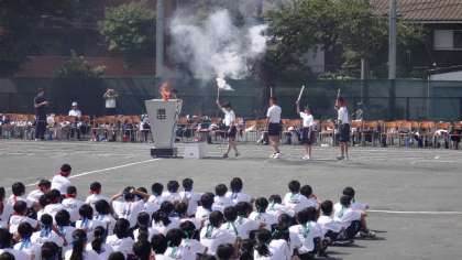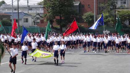 24日(土)、「多摩川の学び舎」瀬田中学校の運動会が行われました。天気がよく日差しは強いものの、さわやかな風が吹き抜ける校庭で、8時45分開会式の入場行進が始まりました。さすが中学生、堂々たる行進です。玉川警察署の白バイが先導して聖火の入場。聖火の後ろには赤、緑、青三色各組の代表が続いて、聖火台に無事火がつきました。