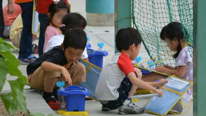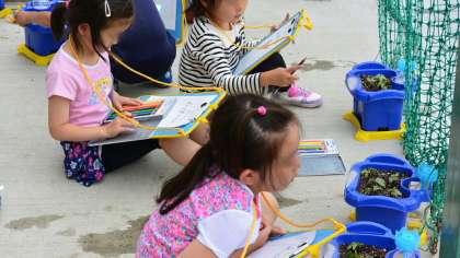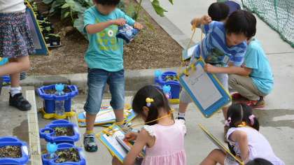 5時間目は1年2組もアサガオの観察をしました。金曜日からグンと成長したアサガオにみんなびっくり。双葉が「4つも出ているよ」「私のは5つ」と自慢合戦です。大事に育てようね。
