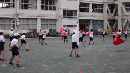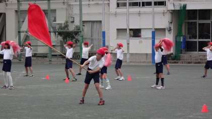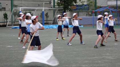 27日朝、早朝まで降り続いていた雨があがり、昨年度改修工事をしたおかげで水はけが大変よくなった校庭で、運動会応援係が朝練習をしました。水はけがよいといってもさすがに地面はまだ柔らかく、リレーの練習は体育館で行い、応援の練習が校庭になったわけです。昨年度の運動会と児童席の配置が変わりましたので、位置決めも大事です。元気な声が校庭に響き渡りました。