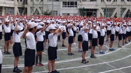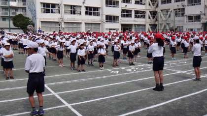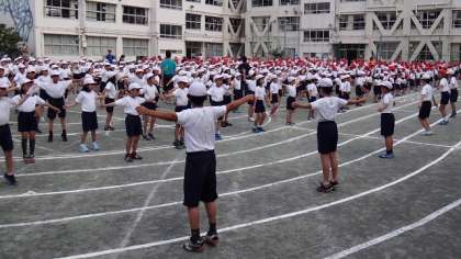 「○○さん基準。体操の隊形に開け。」の号令で「はい!」と大きな声で返事をして,体操の隊形に広がります。素早い動きが身に付いてきました。ラジオ体操も大きな動作で正確にできるようになってきました。