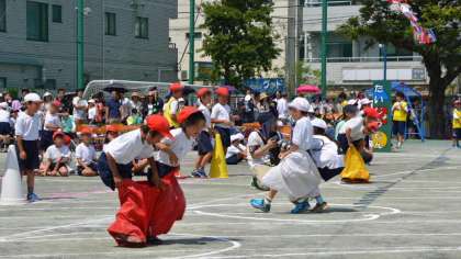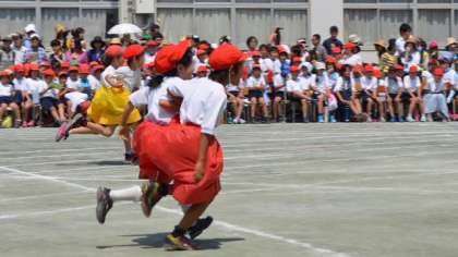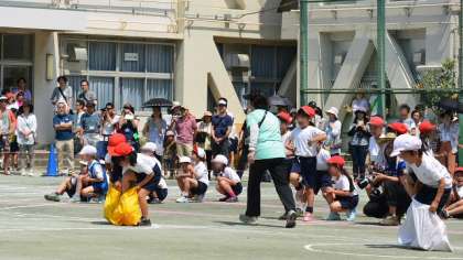 団体種目の1番手は、2年生の「デカデカパン2」です。「デカパンツ」に、片足に1人ずつ入って2人一組でリレーをしました。二人の息を合わせて走り、デカパンツをはくのに手間取らないようにするのがポイントです。一生懸命がんばる子どもたちに、大きな声援がとびました。