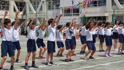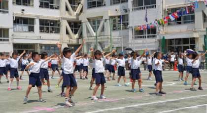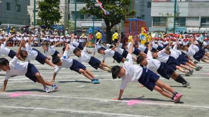 最初の表現種目は3年生の「Let it go」。曲にあわせて一人一人が精一杯に体全体を使って表現します。途中に組体操の要素を取り入れ、一生懸命な子どもたちの表情がキラキラ輝いていました。