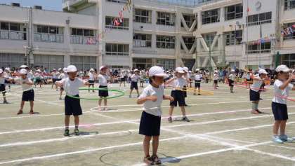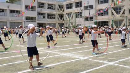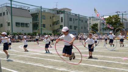 2年生の表現種目は「めざせ!Vサイン」。輪を使った演技です。一人一人がよくがんばって練習し、全員が「腰回し」をできるようになりました。