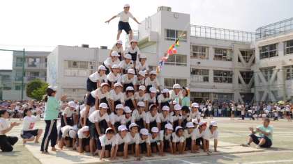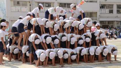 最後は今年小学校生活最後の運動会となる6年生が、全員ピラミッドに挑戦。みんなの気持ちを一つにして下から一段一段積み上げ、7段のピラミッドを完成させました。会場からは大きな歓声と拍手が・・・最後に整列した5・6年生の顔は、みんな達成感に満ちていました。