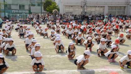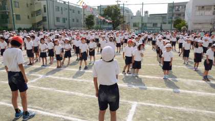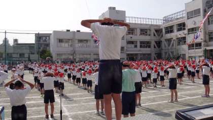 高学年リレーで競技はすべて終了。全員が校庭に整列して、体育委員が前に出て見本を示し、整理体操を行い、今日1日がんばって疲れた体をほぐしました。