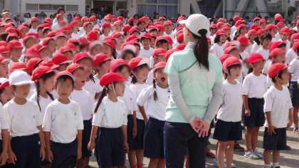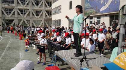 閉会式の最後は、音楽係の伴奏に合わせて校歌斉唱です。今日1日の自分たちを振り返るように、みんなが精一杯声を出し、すばらしい歌声が校庭に響き渡りました。晴天に恵まれたものの、子どもたちの体力が最後までもつかどうか心配になるほど気温が高くなったにもかかわらず、最後までがんばった子どもたちは立派です。この日の成果は、一生懸命歌う子どもたちの晴れやかな表情に表れていたと思います。