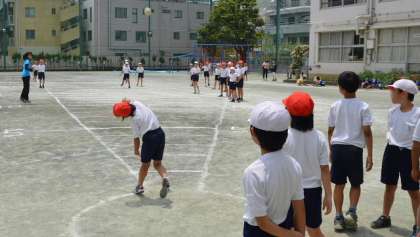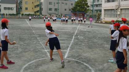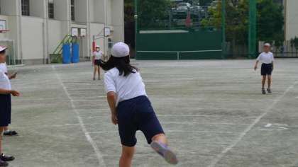 ソフトボール投げ、4・5・6年生のようすです。さすが高学年になると投げ方もさまになっています。しかし、日常の遊びなどの中で、ソフトボールのような大きさ、堅さのものを投げる経験は少なくなっていますから、高学年でもうまくできない子もいます。ボール投げが上手になるというより、バランスのとれた体の動かし方を身につけるという意味で、高学年でももう少し体育の中で取り上げて経験させたいと考えています。