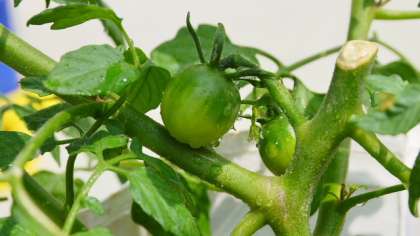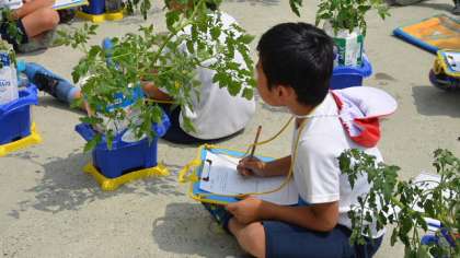 2年生が生活科の栽培活動で育てているミニトマト。5月に小さな苗を植えたのが、こんなに大きく育ちました。子ども立ちが一生懸命観察していました。育ちかたには差がありますが、なかには、もう実がなっているものもあります。もうすぐ赤くなった実が食べられそうですね。