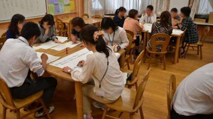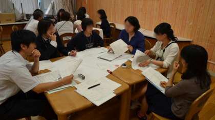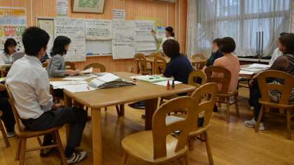 授業後はランチルームで研究協議会です。最初はグループに分かれて、授業観察の結果をまとめ、成果と課題について話し合い、後半は全体に発表した後、意見の交換をしました。授業の改善に向けて、充実した研究会ができました。