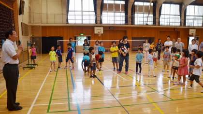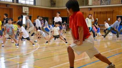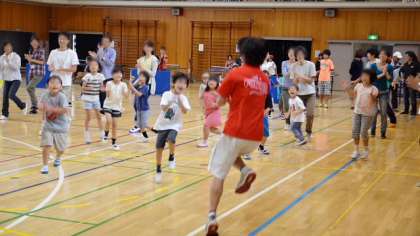 8日(日)午後2時から、第11回みんなで遊ぼう「二子ニコひろば」が体育館で行われました。二子玉川小学校PTAと遊び場開放委員会の主催で、玉川町会との共催で、学校を会場として様々なスポーツに親子で親しむイベントです。予定では校庭も使うことになっていましたが、雨のため体育館だけでの開催となりました。それでも親子併せて100名ほどの皆さんが参加しました。開会式の後、準備体操として、本校副校長のエアロビクスの要素を取り入れたオリジナルのダンスでスタート。これがまた本格的!みなさん大喜びでダンスを楽しみました。