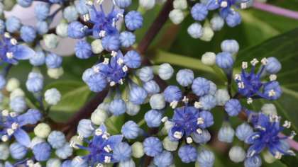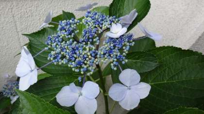 東京も梅雨入りし、アジサイの似合う季節になりました。学校の南校舎と西校舎の間に、ガクアジサイが咲いています。ガクアジサイは「額アジサイ」なのですね。花の周りを額のように花びらのように見える花萼(かがく)が囲っているので「額アジサイ」なのだそうです。よく見ると、真ん中の地味な部分に、花粉がついたおしべが見えます、こっちが「花」ということがよくわかりますね。