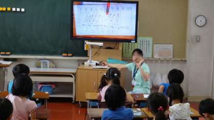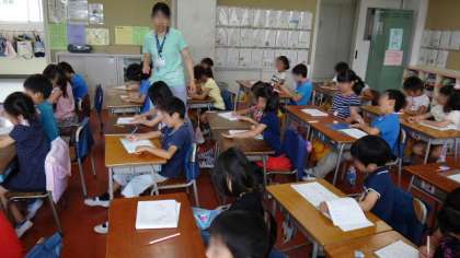 10日(火)、1年1組の算数授業のようすです。たし算の学習です。具体物を使って、それをノートにどう表すかの学習です。考え方をていねいにわかりやすく表すように、大型テレビも使って学習を進めていました。子どもたちは、ノートをきれいに書けていました。大人から見れば簡単なことですが、この時期にきちんと基礎を身につけることが大切です。