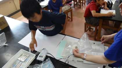 10日、6年3組の理科授業の一コマです。6年生は今、人体の臓器のはたらきについて学習しています。人体の中のことですから、観察や実験は難しいのですが、今回は、肺のはたらきによる、吸気と呼気の成分の違いについて実験しました。グループでは気体検知管を使用して調べ、授業を見に行ったときには、代表の児童が、デジタル気体検知器を使用して調べているところでした。学校でも少しずつ最新鋭の機械を導入して、確かなデータを出すため有効利用しています。