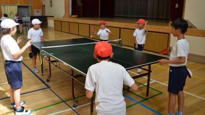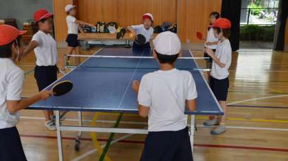 クラブ活動紹介、今日の最後は卓球クラブです。卓球は一昔前はマイナースポーツになりかけたのですが、今やメジャースポーツです。希望者もたくさんいて、人気のクラブです。さすがに希望してクラブに入った子供たち。上手な子もいます。経験のある子供たちが、未経験の子供たちをうまくリードしながら活動していました。