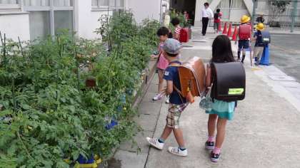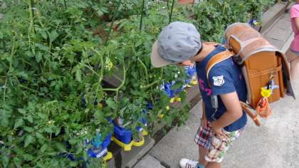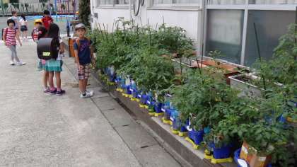 2年生が育てているミニトマト。11日朝のようすです。登校してきた2年生の子どもたちが、自分の鉢に水やりをして、毎日よく観察しています。「昨日よりトマトの実が増えたよ」とうれしそうな表情の子どもたちです。