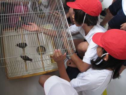 休み時間にたくさんの子どもたちが,雀を見に来ています。