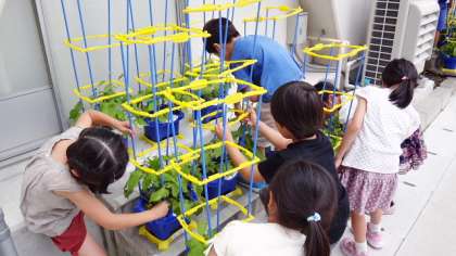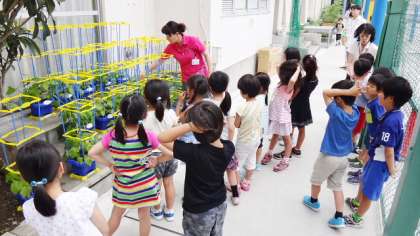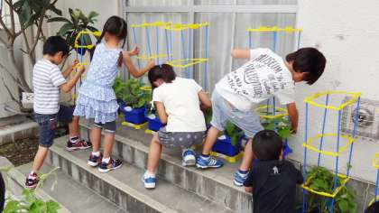 1年生が一人一鉢育てているアサガオ。だいぶ成長してきて、ツルが出始めたので、支柱を取り付けることにしました。大きく育ち始めたアサガオの鉢を大事に抱えて場所を移し、ていねいに支柱を取り付け、「大きく育ってね」という願いを込めて鉢を並べていました。水やりを忘れないでね。