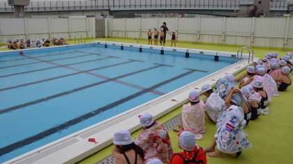 18日(木)3・4校時、1年生のプール開きを行いました。初めて本校のプールを使う1年生。着替えや、プールへの移動をするところからていねいに教えて、3時間目の終わり頃、プールに勢揃いすることができました。ところが、どんよりした空からついに雨が降り始め、プール開きのセレモニーで、児童代表がしっかり今シーズンの目標を述べ、安全と子どもたちの水泳技能の向上を願って、今日は終了ということになりました。