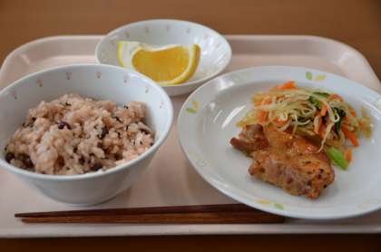 今日のこんだては、明日20日が「開校記念日」なので、おめでたいときに出すお赤飯を用意しました。
