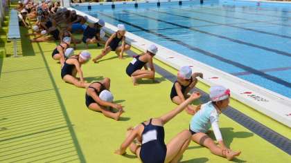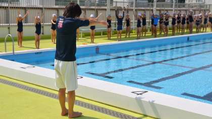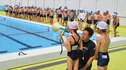 19日5・6校時は、3年生がプール開きをしました。午後から天気が崩れるという予報もありましたが、まだ青空ののぞく中、プール開きを行うことができました。セレモニーでは、2名の代表児童が、今年度の目標をしっかりした口調で述べることができました。準備運動は、3年生も副校長の指導です。本校の副校長は、長年にわたり体育指導の研究を重ねてきたエキスパート。授業内容の充実のためにも、その経験を後輩に伝えようという目的もあります。水に入る前に、ゆったりとした音楽に合わせてストレッチで体をほぐします。体の柔らかい子もいますね。