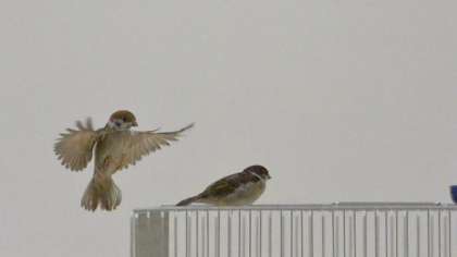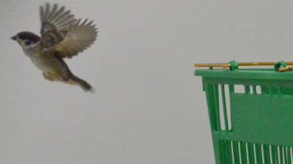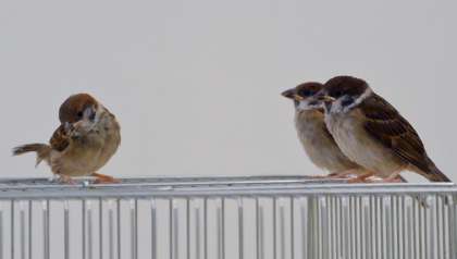 保護して飼育しているスズメのヒナ三羽。もうヒナというより若鳥という風貌になってきました。自然に帰すことをめざして、少し広いところで飛ばせる練習もしています。