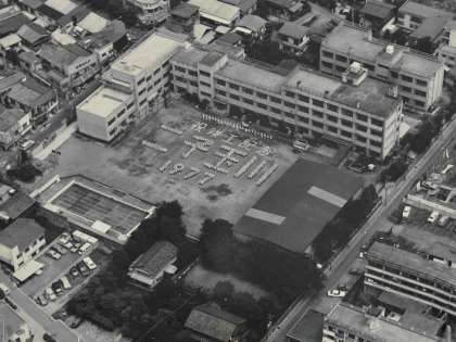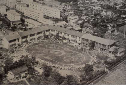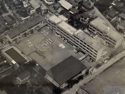 72周年について話した時に使った写真紹介、その2です。上は開校20周年を記念した運動会、中は、開校30周年の頃の様子です。木造校舎が、少しずつ立て替えられたことがわかりますね。昭和52年(1977年)、校舎がすべて鉄筋コンクリート化され、落成式を行った当時の様子です。校舎は現在までそのまま変わっていません。その後、体育館とプールが改築され現在に至っています。