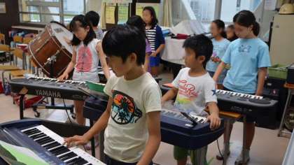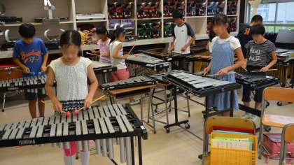 音楽室で活動しているのは音楽クラブ。木曜日の音楽集会の伴奏に備えて器楽合奏の練習をしていました。音楽好きな子どもたちが集まっていて、熱心に練習していました。集会などの発表の場もあるので、活動にも力がはいります。