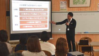 25日(水)10時から、PTA家庭教育学級がランチルームで開催されました。講師に、今年度本校1年生にお子さんが入学された保護者で、厚生労働省「イクメンプロジェクト」推進委員をされている方を講師にお招きして、「イクメン&デキる男にする5つの方法」と題して講演していただきました。講師の先生はテレビや新聞、雑誌などでもご活躍中で、自らの経験なども含めて、父親に家事や子育てに関わってもらう秘訣などをお話ししていただきました。参加者の満足度の高い研修となりました。講師の先生、お忙しいところありがとうございました。学校としても、もっと父親にも教育に関わっていただきたいと思っているところですので、タイムリーな企画となりました。PTA研修教育委員会の皆様にも感謝いたします。
