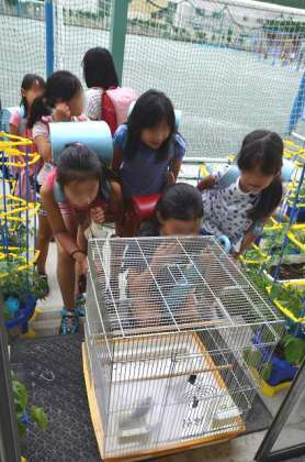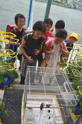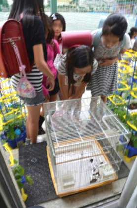 学校で保護したスズメが、だいぶ大きくなって、そろそろ自然に帰すことを考えていることは、以前このページでお伝えしました。今日は、日光浴と外界に親しませるため鳥かごを外に出していました。写真は、下校途中の子が通りかかってのぞき込んでいる様子です。すっかり若鳥の雰囲気になったスズメに驚いていました。
