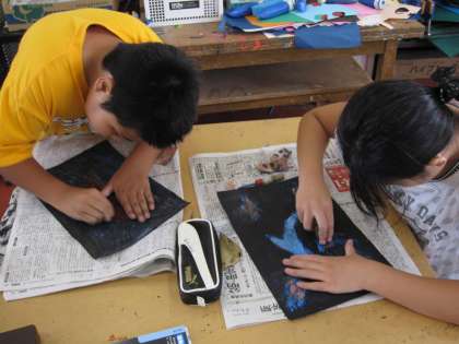 ロウで塗った後に黒のポスターカラーを塗ります。乾いたら紙やすりやきりで表面を削っていきます。