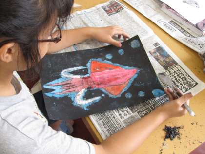 7月2日、6年図工の授業です。「深海の世界」という題で、深海をイメージして,絵の具で絵を描きます。絵の上をロウで塗ります。