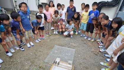 3日昼休み、4年2組の児童が見守る中で、保護していた子スズメを放しました。これまでの経緯を改めて紹介しておきます。この3羽の子スズメは、4年2組のエアコンダクトの巣を撤去した際保護し、その後、親の元にもどすことができず、育てたスズメです。はじめに、子どもたちに自然に帰したとき、この子スズメが、厳しい自然の中で生き残る確率は低いことを話しました。いよいよ放鳥です。子どもたちが子スズメたちに一斉に声をかけますした。「元気でね」「頑張れよ」