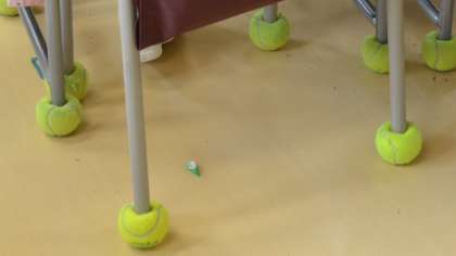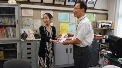 3日放課後、校長室で中古のテニスボールを斡旋していただいたNEC・CSR社会貢献室の代表の方が来校し、贈呈式を行いました。今年1年生に入学してきた補聴器を使用している子のために、ガタガタ音が発生しないよう、教室の机、いすの脚にテニスボールを加工して取り付けました。このボールは、PTAがNEC・CSR社会貢献室とコンタクトをとってくださり、手に入れることができたという経緯があります。贈呈式の後PTA役員さんと一緒に記念写真を撮らせていただきました。ありがとうございました。おかげさまで1年2組の教室の音が大変静かになりました。