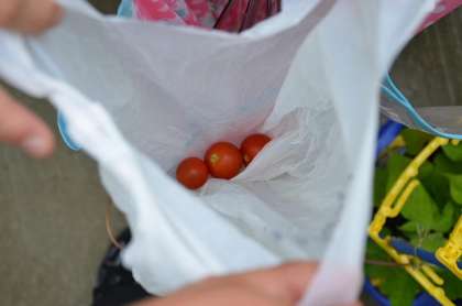 2年生が育てているミニトマトの実が、次々と食べ頃に育っています。放課後、家から持ってきた袋に入れて持ち帰る途中、校長室にうれしそうに見せに来た子供たちです。真っ赤なおいしそうなミニトマトです。自分が育てた物を大切に持ち帰り食べてみることも教育です。たくさん実がなっていますから、2年生は毎日収穫用の袋を持参させてください。