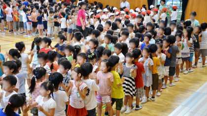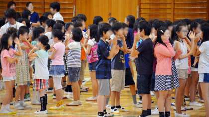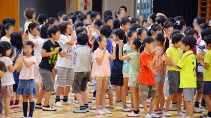 音楽朝会後半は、今月の歌「アルプス一万尺」を、これも手振りを交えて全員で歌いました。本当に楽しそうに歌う子どもたちの姿です。体育館に子どもたちの歌声が響きました。歌うことが好きな子どもたちはとてもすてきです。