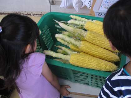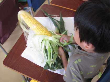 とうもろこしの皮むき作業は,教室で行いました。においや感触を楽しみました。