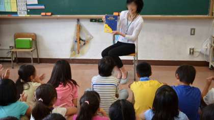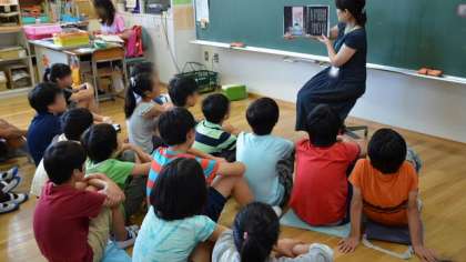 読み聞かせには、高学年もこの通り夢中になっています。4・6年生の様子です。テレビやパソコンなどの映像になれた子どもたちですが、目の前で繰り広げられる生の読み聞かせには、それとはまた違った静かな魅力を感じるのでしょう。