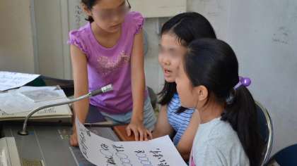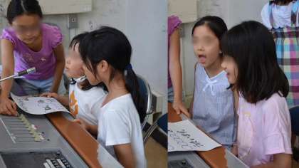 アカペラ大会。11日今日は、2・4・5年生の3グループが歌いました。上手でしたよ。最後にとび入りで先生も参加して「ドラえもん」を熱唱。教室では大盛り上がりでした。