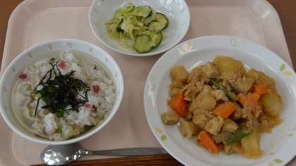 梅茶漬け 牛乳 肉じゃがうま煮 野菜の塩昆布かけ