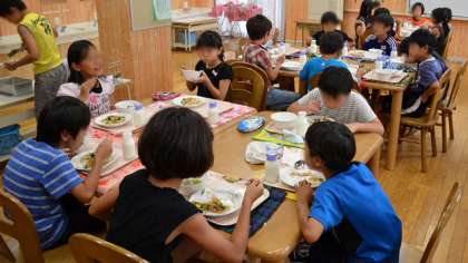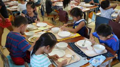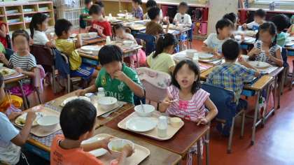16日は1学期最後の給食です。デザートはセレクトデザートで、前もってオレンジシャーベット、フローズンヨーグルト、リンゴシャーベットの3品から選びました。一番人気はリンゴ、僅差でオレンジ、3番人気はヨーグルトでした。ビビンバとレタススープも人気で、みんなよく食べていました。お待ちかねのデザートは、「冷たくてとってもおいしい」という声がみんなからあがりました。