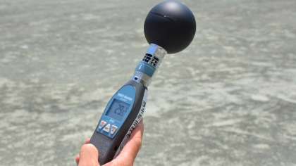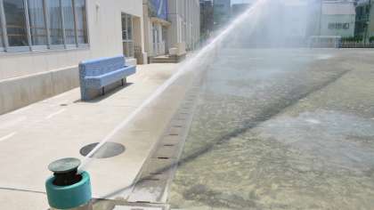 16日、強い日差しが照りつけ記音もうなぎ登り。教室は冷房が効いていて涼しく、学習に差し支えることはないのですが、校庭は暑い砂漠のような状態です。昼休みを前に、スプリンクラーで水をまいてみましたが、焼け石に水状態です。熱中症指数計(測定機器)ではかってみたところ、「熱中症(WBGT)指数」が厳重警戒という結果だったため、熱中症予防ということで、残念ながら外遊びはやらないことにしました。