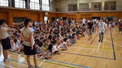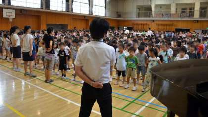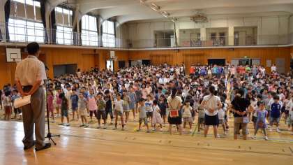 18日(金)朝は、1学期の終業式を体育館で行いました。登校時刻の8時25分を過ぎると、体育館に次々とクラスごとに並んで子どもたちがやってきます。予定通り8時30分に終業式開会です。始めに学校長の話があり、子どもたちはよい姿勢でしっかり聞くことができました。