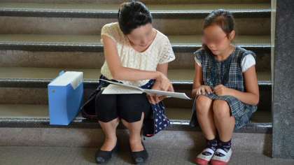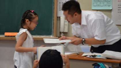 1学期の子どもたちの努力の成果、通知表を手渡ししているようすです。本講の通知表は「あゆみ」といいます。この1学期の歩みの記録です。