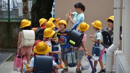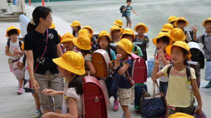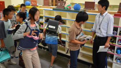 昼、一斉下校の様子です。各クラス担任と一緒に昇降口に出て、さようならのあいさつをして帰ります。名残惜しそうな雰囲気です。