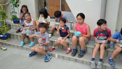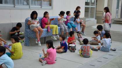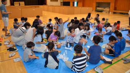 配られたカレーを食べる子どもたちです。感想を聞いてみたら、「おいしい」という声がかえってきました。みんなで食べる食事の楽しさも有るかもしれませんが、アルファ米も、けっこう美味しく食べられました。
