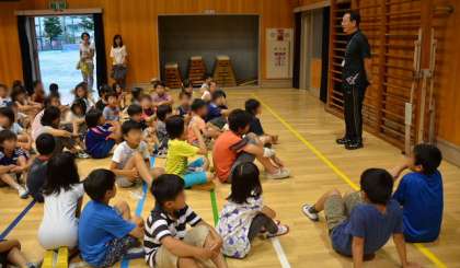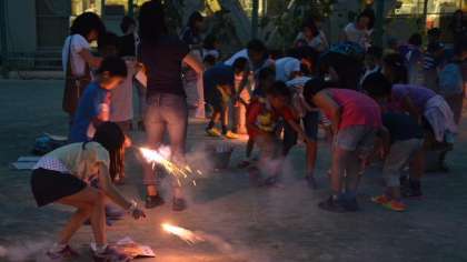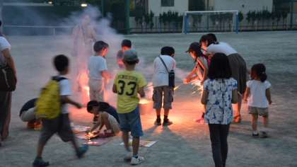 宿泊まで行わず、帰る参加者の訓練はここまでです。中締めの会をしました。その後訓練は一休み。お楽しみの花火を校庭で楽しみました。花火は地元商店街からの寄付です。ありがとうございます。おかげさまで、子どもたちの思い出の一コマとなりました。
