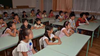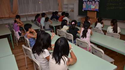楽しい花火の後、宿泊する子どもたちは、防災に関するビデオを、区の職員の方に説明していただきながら防災学習をしました。